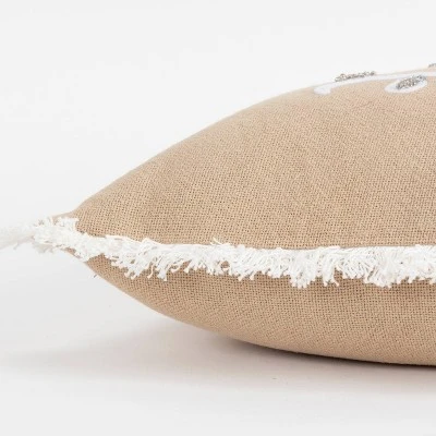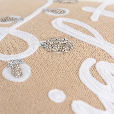 white, Merry and bright on burlap. The SOFTEST of soft cotton burlap in natural for both the front and back of this pillow give it an amazing authenticity. Merry and Bright embroidered in textural flat stitch embroidery bring this pillow the hand crafted look one expects to be paried with the amazing burlap. Christmas ornaments embellishthe word flourishes and are painstakingly hand beaded to bring luster and just a kiss of bling to this tonal pillow. Hand frayed long eyelash fringe frame the entire pillow for a soft luxurious look in this down home, organically crafted pillow. the mathcing burlap solid back also features a hidden zipper closure for ease of fill.