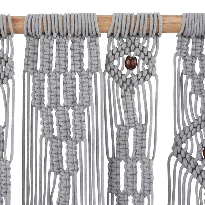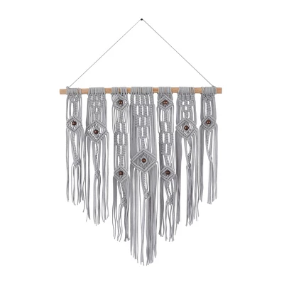 Maximize your open wall and eliminate any negative space with this eye catching wall decor. An extravagant display in a captivating design to elevate the look of your home. Instantly add a beautiful bohemian vibe to your room with this gray macrame woven wall decor that you can easily hang anywhere. This item ships in 1 carton. Can be hung vertically using the cotton cord; nails and screws not included. Suitable for indoor use only. This item ships fully assembled in one piece. Made in India. This is a single gray colored wall sculptures. Bohemian style.
