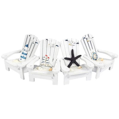 This collection features four charming nautical decorations, perfect for embellishing tables, shelves, or even adding character to DIY beach wreaths, seashell displays, and dollhouse settings. Each intricately designed mini beach chair, measuring 4 x 3.75 x 3.75 inches, is tailored to fit flawlessly into dollhouses, as centerpieces, or to fuel your imaginative craft projects. Adorned with exquisite details including a decorative lighthouse, graceful sailboat, delicate starfish, and whimsical rudder, this set perfectly complements your existing nautical or coastal beach house decor, inviting a touch of maritime enchantment into your living space. Elevate your interior with these delightful pieces that encapsulate the essence of coastal living, turning your home into a haven of ocean-inspired charm.
