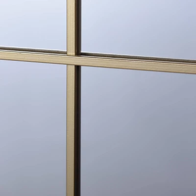 - This mirror has a window pane shape with a grid overlaying the mirror.