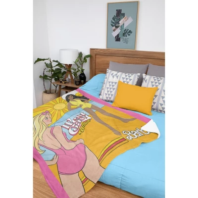 - VIVIDLY COLORED BARBIE DESIGN – This Barbie blanket is perfect for young or old fans alike! This ‘West Coast Wave’ Barbie blanket features Barbie and her friend Nikki enjoying the sunshine of the West Coast on the beach, both wearing swimsuits and standing on the sand.