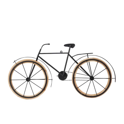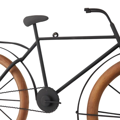 - Natural wood brown and matte black finish highlights this bicycle sculpture