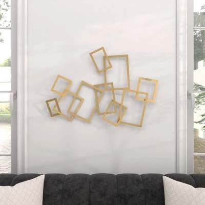 Display this lavish wall art for an elegant touch to any modern and contemporary living space. This item ships in 1 carton. Features 10 interconnected rectangular metal frames. Can be hung horizontally using the sawtooths on the back; nails and screws not included. Suitable for indoor use only. This item ships fully assembled in one piece. This is a single gold colored wall sculptures. Contemporary style.