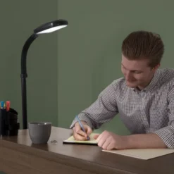 Add a simple lighting solution to your home with this Panel Task Lamp (Includes LED Light Bulb) from Room Essentials™. This task lamp features a square shade along with a rectangle base for a sleek, unique look. Great to cast light on your space to help you work or study in comfort, this solid-color task lamp lights up easily with base push button and comes with one-way light setting.