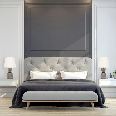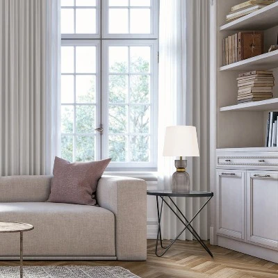- Gold and smoky gray glass bases, white fabric shades